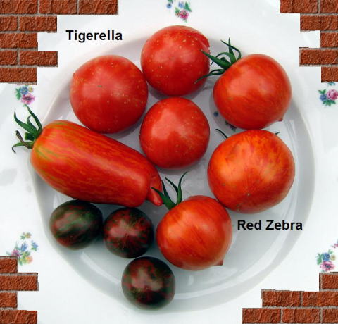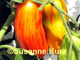 19.09.06 Red Zebra - TigerellaRed Zebra und Tigerella sind an der Fruchtgröße und -zeichnung kaum zu unterscheiden. Heute ist mir jedoch eine kleine Feinheit aufgefallen, mit der es mir nun möglich ist, die geernteten Früchte der passenden Sorte zuzuordnen. Erst jetzt habe ich bemerkt, dass das Red Zebra ein winzige Spitze hat. Naja, ich weiß nicht, ob man das verallgemeinern kann, oder ob das nur bei meinen Pflanzen der Fall ist. Im Bild ist es schön an der unteren Frucht und oben rechts erkennbar.Möglicherweise ist mir das bisher entgangen, weil viele der Red Zebra Freilandfrüchte von der Blütenendfäule befallen waren. Das Red Zebra ist bei mir auch wesentlich platzfester als die Tigerella. Alle auf diesem Bild zu sehenden Tigerellas sind aufgeplatzt, obwohl es sich um die Früchte der überdacht stehenden Pflanze handelt. Die Zeichnung der beiden Sorten ist ziemlich ähnlich, das Red Zebra hat einen stärker orange farbenen Grundton. Die schönste Zeichnung der Roten hat Striped Roman, mit Zickzack förmigen Linien. Und ich habe mal wieder die Safari Tomate aufs Bild geschmuggelt. ![]() |
