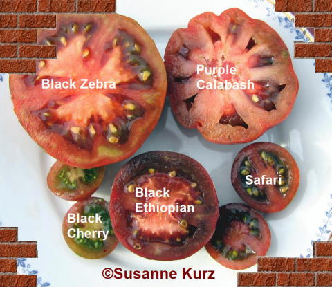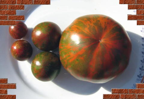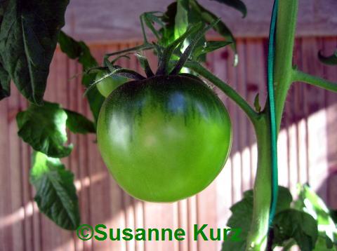 23.09.06 Black Zebra und Safari TomateAuf diesem Bild habe ich die Safari Tomate mit ihrer großen Verwandten, dem Black Zebra aufgenommen. Beide haben eine roten Grundfarbe und dunkelgrüne Streifen. Mein Eindruck ist, dass die Safari Tomate sowohl einen dunkleren Rotton, als auch die dunkleren Streifen aufweist. Meine Black Zebra hat eher einen hellroten bis orangenen Grundton. Die Bilder des Black Zebras, die man bei R.Kraft oder Irina Zacharias findet , sind wesentlich dunkler als meins. |