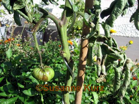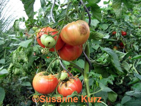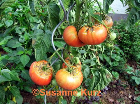 07.09.06 Die nächsten folgenHeute ging es weiter, mit dem Entfernen von Tomatenstöcken. Bei der Stump of the World fiel es mir nicht besonders schwer, die dicksten Früchte waren fast reif, die restlichen Früchte waren so klein, dass sie eh' nicht mehr reif geworden wären. So konnte ich mich leichten Herzens von der Pflanze trennen. Anders sieht es bei der Shimmeig Craig, Ananas und dem Striped Roman aus. Alle haben fleckige Stängel, aber hängen noch voll mit großen, grünen Früchten, denen ich gerne noch etwas Sonne gönnen würde. Mal sehen, aber lange geht das auch nicht mehr gut.Hier ist die Stump of the World zu sehen. Von dieser Seite sieht sie noch ganz gut aus, abgesehen von den vernarbten Rissen. Aber von der anderen Seite erkennt man, dass auch schon einzelne Früchte von der Fäule befallen sind. Die sechs großen Früchte hatten ein Gewicht von 2 KG, daneben habe ich