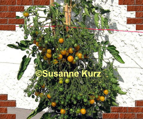 30.09.06 Ildy - tolle KindertomateDieses Bild zeigt meine Ildy-Kübeltomate, die ich allerdings meiner Tochter überlassen habe. Sie beerntet die Pflanze gewissenhaft, so dass ich eigentlich kaum was zum Geschmack sagen kann. Was allerdings nicht zu übersehen ist, ist das die Ildy enorm viele Früchte produziert. Es würde mich mal reizen zu zählen, wieviele Früchte diese Pflanze an ihrem ersten Fruchtstand hat, bzw. hatte, aber das ist mir wirklich zuviel Aufwand. Schätzen würde ich, dass es über 100 sind. Im Bild sind die beiden ersten Fruchttrauben zu erkennen, die Pflanze hat noch welche, die allerdings nicht mehr so ausgeprägt sind. Ist auch besser für die Statik.Gestern war ein 1,5 jähriges Kind zu Besuch, die hat sich auch wie selbstverständlich an den kleinen gelben Früchten der Ildy bedient. Mein Resüme: sehr empfehlenswert. Ebenso kamen die Johannisbeer- und Wildtomaten toll bei den Kindern an. ![]() |