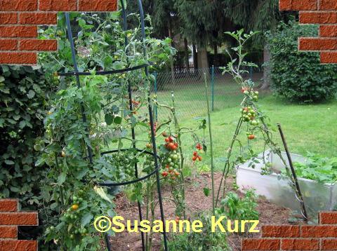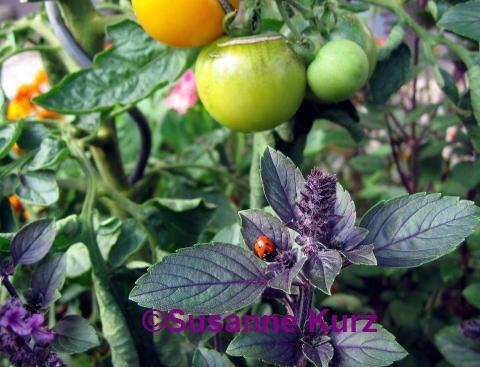 04.09.06 Blondköpfchen und African BlueDer kleine Marienkäfer im Vordergrund hat es sich auf meinem Basilikum African Blue gemütlich gemacht und geniest die Sonnenwärme nach langen Regenwochen. Wie man sieht, habe ich es wieder nicht übers Herz gebracht, die Blütenstände auszubrechen. Die sind bei den Bienen sehr begehrt. Die verschiedenen Basilikumarten habe ich zwischen die Tomatenpflanzen gesetzt. Im Hintergrund sieht man die aufgeplatzten Früchte meines Blondköpfchens.Am Wochenende habe ich mir Zeit genommen und bin durch mein Hauptbeet und habe die Blätter der Pflanzen auf Braunfäule untersucht und alle verdächtigen Blätter entfernt. Danach habe ich die geplatzen, angefaulten und schimmelnde Früchte abgenommen, die Blütenstände ausgeknipst und die Seitentriebe ausgebrochen.Jetzt sieht es wieder einigermaßen passabel aus. Leider musste ich entdecken, dass die Wildtomaten, die ich auf dem Hügelbeet liegend kultiviere, auch dunkel verfärbte Stellen an den Stängeln haben. Ich hoffe, die halten sich noch lange, sie sind nämlich meine absoluten Lieblinge. Wahrscheinlich ernte ich nur einen Bruchteil der Früchte, da kaum ein Durchkommen mehr ist, aber diese kleinen Früchte sind wirklich eine Bereicherung. Sie sind auch ein sehr schöner Blickfang bei verschiedenen Gerichten, die nicht unbedingt mit Tomaten in Verbindung gebracht werden. So kann man z.B. Kartoffelsalat optisch aufpeppen, indem man diese kleinen roten Früchte drüber streut.