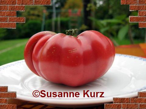 03.09.06 Das dickste DingHeute habe ich meine schwerste Tomate Jahrgang 2006 geerntet, wie nicht anders zu erwarten eine Big Orange Pink Stripes, der verkreuzte Big White Pink Stripes Nachkomme. Dieses Exemplar wiegt 794 Gramm und führt damit vor den anderen zwei Big Orange Früchten mit 720 und 705 Gramm.Danach kommt die Stump of the World, deren schwerste Frucht 450 Gramm wog. |