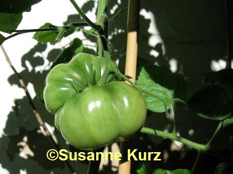 08.09.06 Die HoffnungsträgerNach den beiden Gammeltomatenbeiträgen möchte ich doch noch meine Hoffnungsträger für das Saisonende 2006 vorstellen. Ich hatte doch behauptet, dass in meinem Garten keine einzige Tomate zu finden sei, die nicht aufgeplatzt ist. Das stimmt nur bedingt, am Schuppenrand habe ich noch ein paar Tomaten stehen, denen das Schicksal des Aufplatzens und der Fäule bisher erspart geblieben ist. Da hoffe ich nun auf einen sonnigen Herbst, damit diese Früchte noch ausreifen können.In diesem Bild ist eine große, sehr schöne Black Ethiopian aus dem 4. Fruchtstand zu sehen |