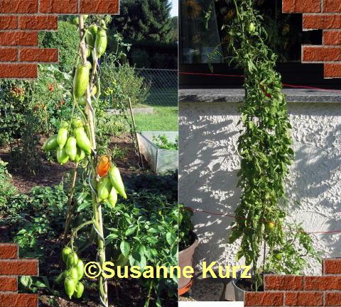 05.09.06 And now, the end is near ....Alles schönreden nutzt nichts mehr, von wegen die dunklen Stellen am Stamm sind nur Druck- und Scheuerstellen vom Anbinden. Und mit dem Entfernen von eine paar Blättern ist es nun auch nicht mehr getan. Ich habe mich soeben für dieses Jahr von der Big Orange Pink Stripes, dem Green Bell Pepper und dem Grünen Zebra verabschiedet. Die beiden letzten Sorten habe ich noch im Kübel, bzw. überdacht am Schuppen stehen. Von der Big Orange (im Bild) konnte ich noch ein Kilo Früchte abnehmen, Green Bell Pepper hatte nur noch ein paar kleine Tomaten getragen, die habe ich gleich mit entsorgt. Vom Green Zebra habe ich ca. 15 unreife Früchte geerntet, die ich zum nachreifen ins Haus geholt habe.
