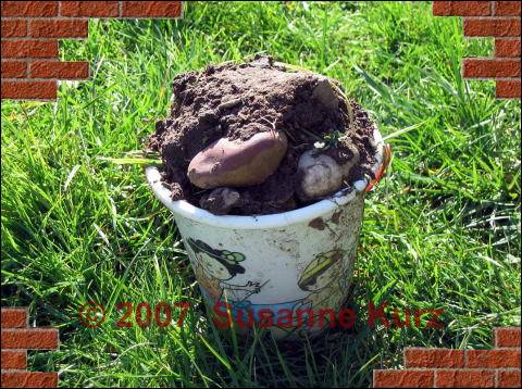 11.03.07 Gärtnern mit Kindern ist ......nur was für NervenstarkeUm in Ruhe das nötigste zu erledigen, lasse ich sie in einem gewissen Rahmen gewähren, so ist z.B. buddeln in der Wiese untersagt, aber die unbestellten Beete habe ich teilweise freigegeben. Dem entsprechend sieht es dort aus, da werden tiefe Löcher gegraben und mit Wasser wieder aufgefüllt. Einige der Kunstwerke habe ich gestern mal fotografiert: Das hier ist z.B. ein Brunnen, bei dem erst das Wasser von der großen (im Bild bereits umgefallenen) Gießkanne in die kleine Kanne lief und dann in Mutters Tupperschüssel, die mit großen Steinen verziert wurde.