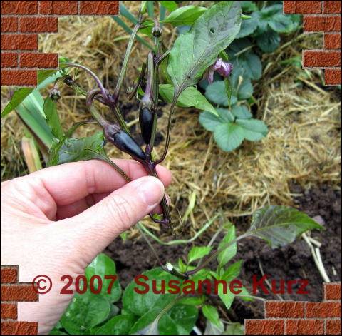 15.05.07 Chili-MordHeute habe ich festgestellt, dass meine Czechoslovakian Black, die ich bereits ins Freiland gesetzt hatte, abgebrochen ist. Es war zwar sehr windig in den letzten Tagen, aber da wäre die Pflanze eher geknickt und nicht so sauber abgebrochen, wie in diesem Bild zu sehen ist.