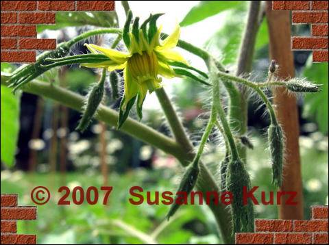 18.05.07 Erste Fleischtomate blühtHeute hat sich die erste Blüte einer Fleischtomate geöffnet, sie gehört zu der bereits mehrmals erwähnten Lenis sibirischer Riese. Das ist ja wirklich ein tolles, frühes Früchtchen. Von meinen normalen Stabtomaten ist noch keine Pflanze soweit, dort wird wohl die Reisetomate die erste blühende Pflanze sein. Ach ja, die Lenis sibirischer Riese steht im Freiland, die niedrigen Nachttemperaturen machen ihr wohl wenig aus. Sehr gut im Bild zu erkennen, ist der herausragende Stempel, d.h. ich muss schon mal das Material zum Verhüllen der noch geschlossenen Blüten zwecks Gewinnung von sortenreinem Samen bereithalten. Darüber habe ich im letzten Jahr hier schon mal was geschrieben. Von Leni hatte ich im letzten Jahr auch die weißen Zucchini im Tausch bekommen, von denen ich so begeisstert bin. Leni hat gute Verbindungen nach Tschechien, so dass sie manch interessante Sorte kennt, die hier nicht so üblich ist. Ich habe auch noch Saatgut von einer langen, dünnen Bauerntomate von ihr, das muss ich dann wohl im nächsten Jahr austesten. Ihre tolle Fleischtomate ist bisher ja klasse. Als nächste Fleischtomate wird wohl die Graf Batthyány ihre Blüten öffnen, auch eine frühe Sorte. Die wurde mir von Reinhard Kraft empfohlen.
