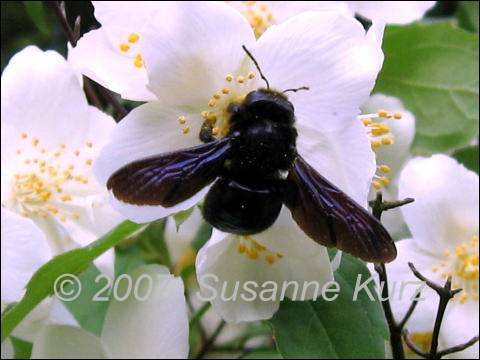 19.05.07 Besuch einer HolzbieneHeute habe ich wieder Besuch von einer Holzbiene gehabt. Letztes Jahr im August habe ich diese interessante Wildbiene zum erstenmal in meinem Garten beobachtet, wie ich in diesem Beitrag berichtet hatte. Nach dem Kommentar von Helmut, dass Holzbienen von Muskatellersalbei angezogen werden, habe ich in diesem Jahr natürlich sofort welchen ausgesät (Danke Annemarie!). Wenn ich es richtig verstanden habe, blüht der allerdings erst im nächsten Jahr. Allerdings findet die Holzbiene auch diesen Jasmin-Strauch sehr attraktiv. Ich konnte in Ruhe ins Haus gehen, um meinen Fotoapparat zu holen, zurückkommen und einige Bilder von diesem aussergewöhnlichen Insekt zu machen. Leider kommt wieder mal nicht raus, wie groß diese Biene ist.