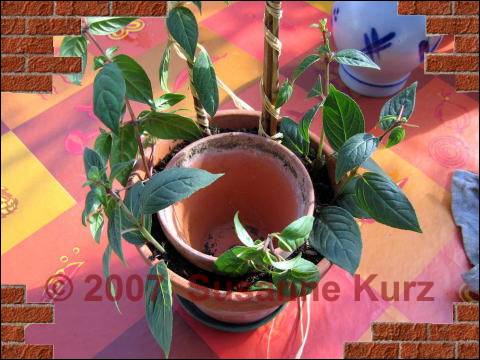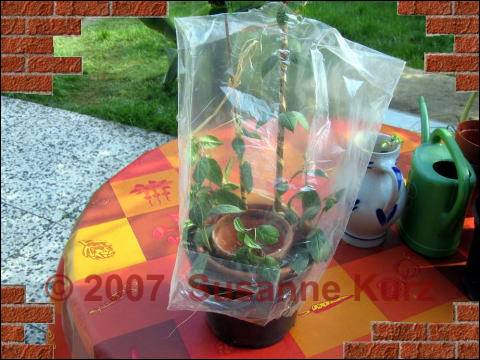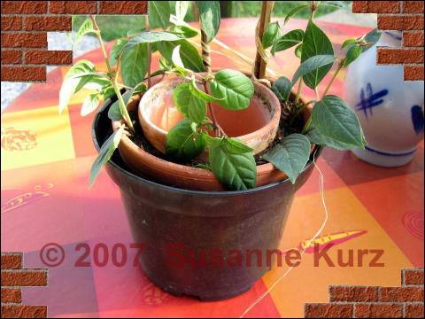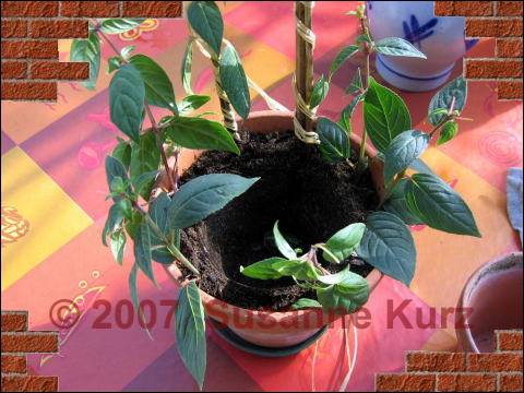 28.05.07 Fuchsien StecklingeVor gut 4 Wochen habe ich von meiner Fuchsien - Neuerwerbung berichtet, der ich ein ca. 50 cm langes Ästchen abgeschnitten habe, aus dem ich ein Fuchsien Hochstämmchen ziehen möchte. Da man so tolles Ausgangsmaterial nicht so oft vorfindet und ich mir kurz darauf noch eine weitere Fuchsie gegönnt habe, die ich auch erst mal zurechtgestutzt habe, habe mich an eine Methode erinnert, die in einem meiner Gartenbücher zur Stecklingsvermehrung empfohlen wird. Ich hatte sie auch früher mal erfolgreich angewendet, und so habe ich diesesmal auch darauf zurückgegriffen.Diese Methode wird empfohlen, wenn man mehrere halbreife Stecklinge bewurzeln will. Die krautigen Stecklinge werden in einer Länge von 10-20 cm geschnitten und die untersten Blätter, die Blüten sowie die Knospen entfernt. Dann steckt man sie in einen, mit einem Sand-Torf Gemisch gefüllten Tontopf an die Topfwand (ich habe normale Blumenerde verwendet). Die Stecklinge bewurzeln besser, wenn sie nicht in der Mitte des Topfes stecken, sondern am Rand. Durch die poröse Wand des Gefäßes nehmen sie zusätzlich Sauerstoff auf, das fördert die Wurzelentwicklung. Um diesen Effekt noch zu verbessern, stellt man einen kleineren Tontopf in einen größeren. Der Innere bleibt leer, der Raum zwischen den Töpfen wird mit Substrat gefüllt. Da hinein kommten dann die Stecklinge.