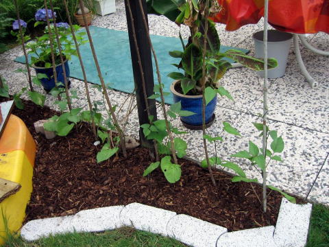 15.06.07 Sichtschutz aus FeuerbohnenBin ganz stolz auf mich! Ich habe wieder eine winzig kleine Schmuddelecke aufgeräumt. Zwischen Terasse und Sandkasten war ein kleiner Streifen Wiese, an den man mit dem Rasenmäher nicht ran kam. Dort mußte das Gras von Hand geschnitten werden, aber wie man in diesem Bild erkennen kann, wurde das auch nicht so regelmäßig gemacht.