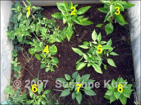 05.06.07 ChilibeetDie Chilis, die ich früh ins Freiland gesetzt habe, sehen erbärmlich aus. Die Czecheslovakian Black ist abgebrochen (Vögel?), dabei habe ich schöne Fruchtansätze, Blüten und Knospen verloren. Die Pflanze lebt noch und treibt auch schön aus, aber sie ist jetzt doch zeitlich ziemlich hinterher. Das Idar-Obersteiner Herzje hatte auch zwei schöne Früchte, die beide Schneckenopfer wurden, eine Frucht wurde angefressen und bei der anderen Frucht wurde der Stängel angenagt, so dass die Frucht abfiel. Die Blätter der Numex Suave sind ziemlich zerlöchert, bei der sind auch noch nicht mal Blüten zu sehen, lediglich Knospen. Also insgesamt ein jämmerliches Bild.Von den Sorten, die im Freiland stehen hatte ich Reservepflanzen im Foliengewächshäuschen behalten, die ich nun zusammen mit den Chilis, von denen ich nur ein Exemplar hatte in meinen nicht genutzten Frühbeetkasten gesetzt habe. Die Grube, die nach dem Aushub des verrotteten Mists entstand, habe ich mit abgelagertem Kompost gefüllt und obenauf noch eine Lage Blumenerde gegeben. Die Pflanzen stehen durch die Grube etwas tiefer, so dass ich den Deckel des Kastens abends schließen kann.