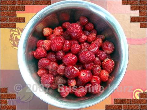 07.06.07 ErdbeerernteIm Bild sieht man die erste richtige Erdbeerernte des Jahres. Bisher sind zwar Erdbeeren gepflückt worden, doch die fanden keinen Weg in die Küche, sondern sind direkt vor Ort, noch sonnenwarm verspeisst worden. In der Schüssel haben wir ca. 800 gr, doch wir haben nicht alles geerntet, sondern noch einige Früchte dran gelassen, die wir in den nächsten Tagen abnehmen können. Vor zwei Jahren habe ich mir je 10 Pflanzen Mieze Schindler und Polka als Bestäubersorte zugelegt, da die Mieze Schindler nur weibliche Blüten besitzt. Die Ausläufer der Pflanzen habe ich nicht entfernt, so dass sich die Erdbeeren das Nachbarbeet erobert haben. Heute konnte ich feststellen, dass es vorwiegend die Miezen sind, die sich so ausgebreitet haben. Sie sind meine absoluten Lieblingserdbeeren. Die Polka können geschmacklich überhaupt nicht mit der Mieze mithalten, sie schmecken in etwa wie die Erdbeeren, die im Handel sind.Nach nunmehr zwei Jahren, werde ich die Pflanzen im alte Beet entfernen, und die jungen Ausläufer behalten. Am liebsten würde ich nur noch Mieze Schindler behalten, ich weiß aber nicht, ob ich es riskieren soll, die Polkas ganz zu entfernen. Ich habe auch noch Monats- und Walderdbeeren, mein Nachbar hat ebenfalls Erdbeeren, es könnte also funktionieren, im nächsten Jahr nur noch Mieze Schindler zu haben. Der Geschmack ist einfach sensationell, man braucht die Erdbeeren nicht zu zuckern, sie sind von Natur aus sehr süß. Sie sind mir viel zu schade, um sie zu verarbeiten, die werden einfach so gegessen..