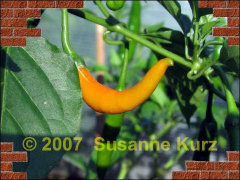 13.06.07 Erste Chili ist reifHeute wurde die erste Chili geerntet. Es handelt sich um die Sorte Criolla Sella, die von meiner Tomatenfreundin Karin herangezogen wurde. Die Aussaat war (sehr wahrscheinlich) Anfang Januar und damit ca. 2 Wochen vor meinen eigenen Sorten. Bei denen zeigt sich noch keine Farbe. Am weitesten zurück ist die Numex Suave, da habe ich heute die erste Blüte entdeckt.