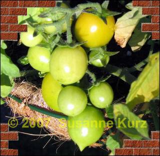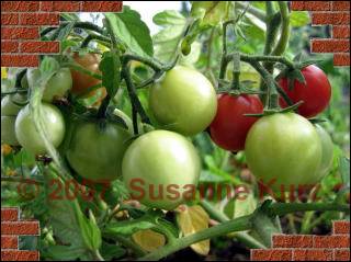 21.06.07 Erste Sorte ist reifIch würde sagen, die erste Sorte ist reif. And the Winner is.... Gartenperle. Ausgesät am 2.3. und reif am 21.6., das sind 3 1/2 Monate, die diese Pflanze bis zur Reife gebraucht hat. Die Pendulina steht ihr nur um ein paar Tage nach. Geerntet wird erst am Wochenende, denn dann kommt die ganze Familie zu Besuch, und ich will tüchtig angeben mit meinen reifen Tomaten. Ich mußte mir schon so viel Spott anhören über meinen Tomatentick, insbesondere, wenn meine abgeschnittenen hautfarbenen Feinstrumpfhosen als Verhüterli in den Pflanzen hängen, da muss ich mal ausgiebig protzen