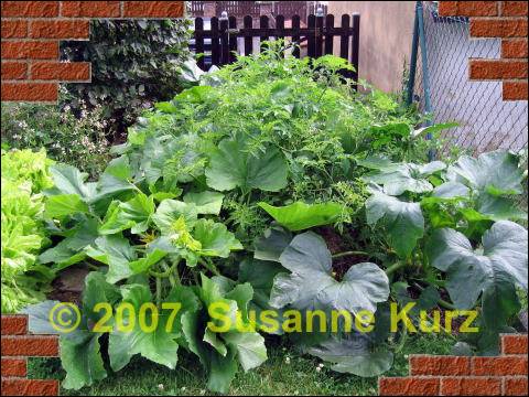 Im letzten Jahr hatte ich 5 Wild- und Johannisbeertomaten gepflanzt, in diesem Jahr nur 3 Pflanzen (Kleinbeerige Wildtomate, weisse Johannisbeertomate und die rote Wildtomate). Letztes Jahr hatte ich 3 Kürbispflanzen, in diesem Jahr sind es vier, so ist die Summe der Zucchini und Kürbisse gleich geblieben. Hinzu kommen erstmalig 4 Gurkenpflanzen am Zaun entlang. Im Februar habe ich das Hügelbeet noch verlängert (siehe Eintrag vom 17.2.) Trotzdem ist jetzt schon alles überwuchert. |