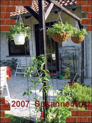 19.06.07 Langsam kommt Farbe ins SpielLangsam färben sich die ersten Tomaten, allen voran die Gartenperle und die Pendulina. Diese beiden Sorten habe ich Anfang März ausgesät und in Hängeampeln gepflanzt. Ich habe jeweils 3 Pflanzen zusammen mit einer Pepino in einen Hanging Basket gepflanzt. Das ist ziemlich eng und an heißen Tagen muss mehrmals gegossen werden.