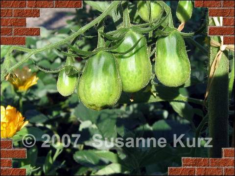 11.06.07 Lenis Sibirischer RieseIch habe bereits mehrfach über diese Sorte geschrieben, jetzt kann ich ein Bild der Früchte zeigen. Für mich sieht sie nicht nach einer Fleischtomate aus, die kenne ich nur mit platt runden oder bestenfalls hoch runden Früchten. Diese Pflanze entwickelt eher birnenförmige Früchte. Dann muss ich mich überraschen lassen, wie sie sich weiter entwickelt. Sie ist immer noch eine der höchsten Pflanzen, die ich habe.