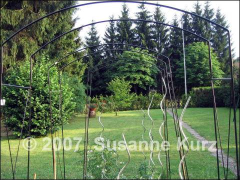 um wen es sich handelt.Dann habe ich noch die Carnica ausgepflanzt und ihr eine Kletterhilfe am Pergolapfosten angebracht. Ich habe einen billigen Rosenbogen für 10 € erstanden, dessen Seitenteile ich am Pergolapfosten angebracht habe. Daran kann ich die Carnica nun besser befestigen. Dazu habe ich noch einige vorgezogene Feuerbohnen gesetzt, die ebenfalls daran hochranken sollen (wenn sie von den Schnecken verschont bleiben). Der Rosenbogen hat mich inzwischen auch auf die Idee gebracht, dass ich mir noch 3 kaufe, diese auf die Länge meines Beetes (ca. 3 Meter) verteile und eine Folie drüber spanne. Dann hätte ich ein 2 m hohes Tomatendach für eine Reihe relativ preiswert gebaut. Lediglich die Verankerung, damit das Dach nicht beim ersten Windhauch wegweht muß ich nochmals überdenken. Aber irgendwie gefällt mir der Gedanke. |