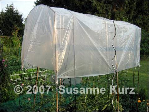 25.06.07 Tomatendach - Teil 1: Planung und AufbauAm 3.6.07 habe ich von meiner Rankhilfe berichtet, die ich aus einem preiswerten Rosenbogen gebaut habe. Damals hatte ich die Idee, dass ich mehrere Rosenbögen hintereinander aufstellen und eine Folie drüber spannen könnte, so dass ich ein Tomatendach für zwei Reihen meiner Freilandtomaten hätte. Ich war dann nochmals im Baumarkt um die Rosenbögen zu besorgen, aber die Bögen, die noch zum Preis von 10 € angeboten wurden hatten verbogene Enden, so dass ich sie doch nicht gekauft habe. Doch die Idee lies mich nicht los, so dass ich ein paar Tag wild entschlossen die krummen Teile zu kaufen und selbst gerade zu biegen, wieder zum Baumarkt gefahren bin. Naja, was soll ich sagen, es waren keine mehr da. Ich konnte allerdings ein anderes Modell zum gleichen Preis bekommen, das hat jedoch nur 2 senkrechte Stäbe, die anderen hatten 3. Insgesamt schauen diese Rosenbögen sehr viel filigraner, man könnte auch sagen wackeliger aus. Ich fing wieder zu zögern und zu zaudern an: "vielleicht kriege ich in einem anderen Baumarkt stabilere Rosenbögen zu dem Preis", "gibt es nicht gerade bei Prak*tiker 20% auf alles?" usw. Ich habe mir dann selbst in den Hintern getreten und doch drei Rosenbögen gekauft. Schritt 1 war schon mal geschafft.Schritt 2 wäre dann die Planung, wie bespanne ich die Bögen, nur oben oder ziehe ich ein Seitenteil bis zum Boden. Wenn ja, welches? Ost- oder Westseite? Wenn ein Seitenteil bis zum Boden reicht, komme ich dann von der anderen Seite gut an alle Pflanzen zur Pflege und zur Ernte? Mit welcher Folie bespanne ich die Bögen, wie befestige ich die? Wie verankere ich die Rosenbögen in der Erde.... Fragen über Fragen und wieder so schwierige Entscheidungen zu treffen. Ich habe über der Web Seite von DM Folien gebrütet, über Folienstärken, Ösen zum Befestigen der Folie an den Bögen, Erdnägeln zur Bestigung der Folie auf dem Boden nachgedacht, und konnte mich doch zu keiner Entscheidung durchringen. Ich kam mir fast schon vor, wie der sprichwörtliche Esel, der sich nicht entscheiden kann, ob er aus dem rechten oder linken Futterkorb fressen soll und dabei letztendlich verhungert ist. Nachdem jedoch Mitte letzter Woche ein Wetterumschwung mit Regen und Gewittern vorhergesagt wurde, habe ich mich dann doch zu einer Entscheidung durchgerungen: Ich habe mir eine extra starke Abdeckplane 2,5 m x 4m gekauft, die man beim Tapezieren verwendet. Dann noch etwas Klebeband und ich war mit etwas über 5 € Investition dabei. Abends habe ich dann die drei Rosenbögen über zwei Reihen Tomaten aufgebaut.