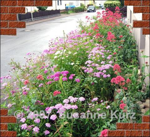 01.06.07 Die etwas andere FarbkombinationIn meinem schmalen Vorgarten blüht es derzeit überaus üppig. Die abgebildeten Pflanzen haben sich hier im wesenlichen selbst angesiedelt. Die fliederfarbenen Blumen, die es auch in weiss oder lila gibt nennt meine Nachbarin "Schwarzwaldmädel", wohl weil die Form an die typischen Hutformen erinnert. Die Bezeichnung scheint aber nicht üblich zu sein, unter Google fand ich nichts zu diesem Begriff. Es scheint sich um die "doldige Schleifenblume" oder Iberis umbellata zu handeln. Zu diesem Fliedertönen gesellen sich lachs-rosa Spornblumen. Von der Pflanze hatte ich im vorletzten Sommer nur eine im Vorgarten, die sich dann kräftig aussäte. Im letzten Jahr versuchte ich diese Blumen zu jäten und stellte dann fest, dass das nicht so einfach ist, sie bilden eine ziemlich kräftige, rübenförmige Wurzel, die leicht abbricht.