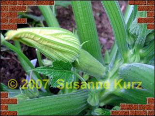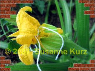 22.06.07 Handbestäubung von ZucchiniEins vorneweg: ich mache das zum erstenmal. Das ist also keine Anleitung, die 100% ig funktioniert, sondern so wie Lieschen Müller, ähh Susanne Kurz sich die sortenreine Vermehrung von Zucchini vorstellt. Also nehmt das bitte als Erfahrungsbericht, kann sein, dass ich nächstes Jahr schreiben muss, dass die Zucchini Samen doch verkreuzt waren.Gestern abend habe ich die erste weibliche Zucchiniblüte an meiner weissen Zucchini entdeckt, ich nahm an, dass sie sich heute morgen öffnet.