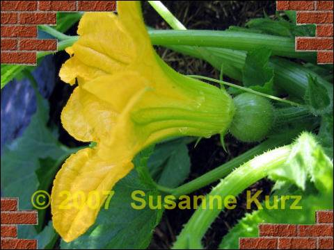 14.06.07 Tondo Chiaro di NizzaDie erste Zucchiniblüte hat sich heute geöffnet, es ist eine weibliche Blüte, was sich leicht an dem verdickten Knoten am Ende der Blüte erkennen läßt. Die männlichen Blüten haben einen langen dünnen Stiel und ihnen fehlt die Verdickung am Blütenende. Leider ist in meinem Garten noch keine männliche Blüte einer Zucchini oder eines Kürbis zu finden, daher ist eine Befruchtung dieser Blüte eher unwahrscheinlich.