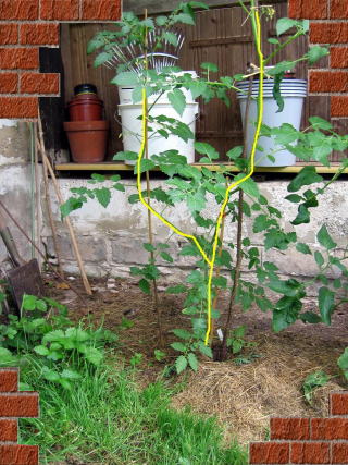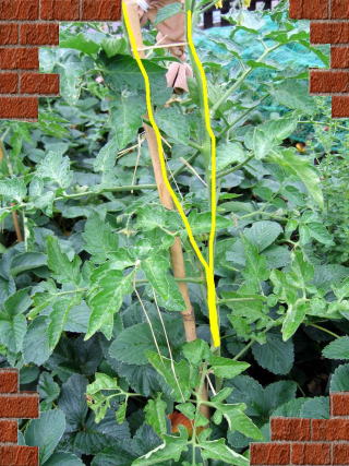 16.06.07 Zweitriebige TomatenIn der Regel wird empfohlen Tomaten eintriebig zu ziehen. Ein Vorteil ist, dass die Pflanze übersichtlicher ist, weniger Blattmasse bildet, die besser abtrocknen kann, was der Vorbeugung von Krankheiten dienlich ist. Des weiteren werden zwar in Summe weniger Früchte ausgebildet, diese sind aber in der Regel größer.Ich habe mehrere Tomaten zweitriebig gezogen, die ich Euch gerne vorstellen möchte. In den meisten Fällen war das eher unbeabsichtigt und nur dadurch entstanden, dass ich zu spät ausgegeizt habe. Wenn man ausreichend Platz zur Verfügung hat, kann man einen zweiten Stab für den Seitentrieb bereithalten, wie man in diesem Bild von der Bianca sehen kann.