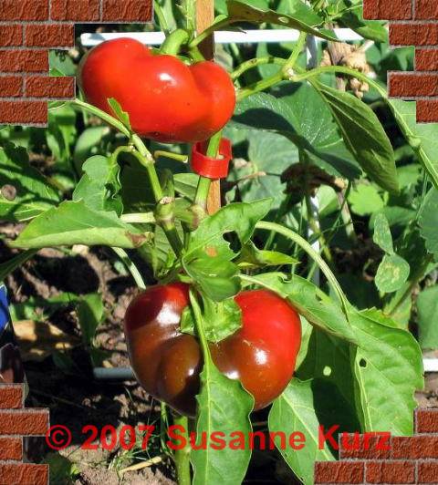 15.08.07 Albanische TomatenpaprikaDie albanische Tomatenpaprika ist die einzige Paprika, die meinen Erwartungen an eine Paprika entspricht und mit den diesjährigen Wetterbedingungen klar kommt. Sie hat ein dickes Fruchtfleisch und schmeckt sehr gut. Sowohl von der Pflanze im Beet, als auch von der etwas geschützteren Pflanze im Frühbeetkasten konnte ich schon ein paar Früchte ernten. Die ersten sieht man auf dem unteren Bild vom 15.7.