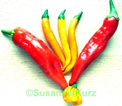 Von der Numex Suave habe ich zwei Pflanzen, die erste Frucht, die ich verkostet habe, war so scharf, dass ich sie wegwerfen mußte. Von der zweiten Pflanze habe ich inzwischen zwei Früchte geerntet, die überhaupt nicht scharf sind. Rein optisch sind die Früchte gleich. Bin mal gespannt, ob die nächste Frucht von der ersten Numex auch wieder so scharf ist. Ich muss sagen, Chilies sind nicht so mein Ding. Ich bleibe wohl bei der Tequila Sunrise, Checheslovakian Black und das war's. Bin halt ein echtes Chili-Weichei. |