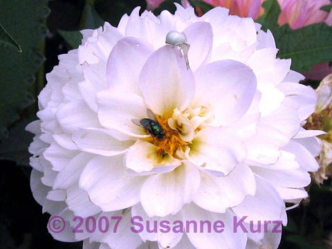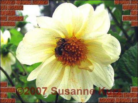 11.08.07 GedrängelIm letzten Jahr habe ich Dahlien aus Samen selbst gezogen. Darüber hatte ich am 29.10.06 bereits kurz berichtet. Die Überwinterung hat auch weitestgehend geklappt, leider ist keine rosa Dahlie mehr dabei, aber das war eher ein Schneckenproblem. Obwohl ich die Dahlien nach dem Ausräumen aus dem Winterquartier in Eimern vorgetrieben habe, damit sie schon eine gewisse Größe haben, haben die Biester mir die kleineren Dahlien bis auf den Strunk abgenagt. Über die großen Dahlien sind sie zwar auch hergefallen, die blieben davon jedoch unbeeindruckt.. Diese weiße Dahlie ist sehr gut über den Winter gekommen und steht in der Größe meinen älteren Dahlien in nichts nach. Diese ungefüllte Dahlie ist bei Bienen sehr beliebt, manchmal drängeln sich bis zu vier Tiere gleichzeitig in der Blüte.