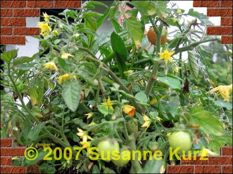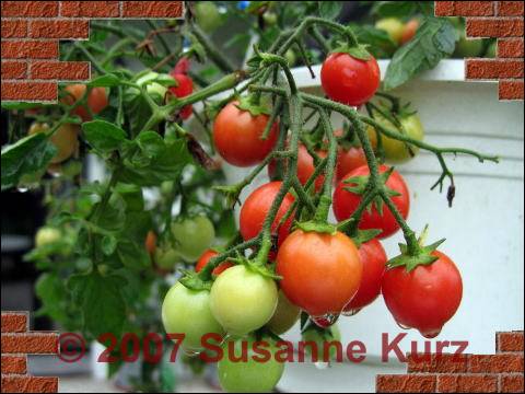 12.08.07 GartenperleHabe ich bei der Beschreibung der White Currant von der Entdeckung des Jahres gesprochen, so habe ich bei der Gartenperle in diesem Jahr Eigenschaften entdeckt, die mir im letzten Jahr nicht aufgefallen sind und auch nicht auffallen konnten. In diesem Jahr sind die Gartenperlen in einer Hängeampel untergebracht, die gänzlich ungeschützt aufgehängt ist, so dass die Pflanzen ständig dem Regen ausgesetzt sind. Das haben sie, wie auch die Pendulina in einer anderen Hängeampel ohne Anzeichen von Braun- und Krautfäule überstanden.