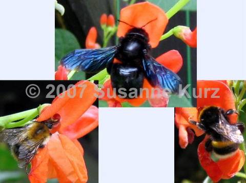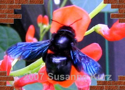 25.08.07 HolzbieneNachdem ich nun wieder zwei Beiträge zum Thema Tomate eingeschoben habe, kann ich mich nun wieder ohne schlechtes Gewissen meinen 6 und 8 beinigen Gartenbesuchern widmen. Vor ein paar Tagen hatte ich wieder Besuch von der Holzbiene.