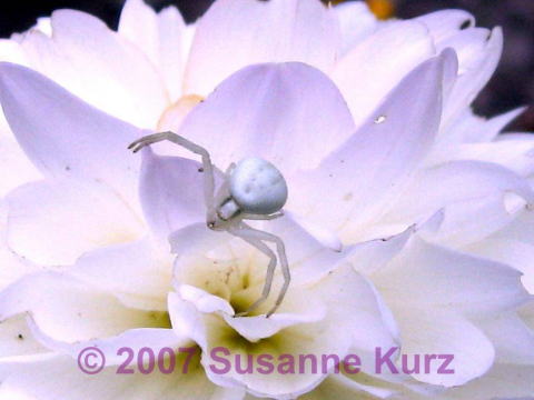 16.08.07 KrabbenspinneIch weiss, meine Web Seite heißt tomaten.gmxhome.de und nicht spinnen-und-hummeln.gmxhome.de oder alles-was-kreucht-und-fleucht.gmxhome.de, aber tomatenmäßig ist in diesem Jahr nicht mehr all zu viel los, die Braun- und Krautfäule hat mir nur noch ein paar Kübelpflanzen gelassen, und über die habe ich weitestgehend schon geschrieben. Gestern aben hatte ich allerdings dieses Fotomodell vor der Linse, das gibt doch einiges her.