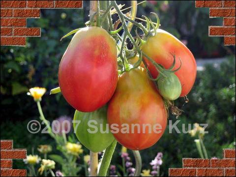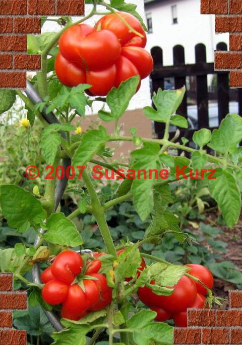 20.08.07 ReisetomateEine meiner verbliebenen Freilandtomaten ist die Reisetomate. Die Früchte haben eine Gewicht von ca. 130 Gramm, jede Frucht setzt sich aus vielen Teilfrüchten zusammen, die man einfach abbrechen kann, ohne das Saft austritt. Ich habe sie von Reinhard Kraft erhalten, der mich im Vorfeld gewarnt hat, dass sie nicht unbedingt eine Feinschmeckertomate sei. Das mag sein, aber durch ihre aussergewöhnliche Form und ihre robuste Natur mit der sie der Braun- und Krautfäule getrotzt hat, hat sie fast schon einen Stammplatz in meinem Tomatenbeet erobert.