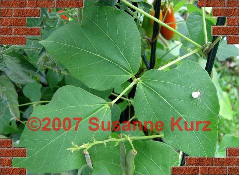 07.08.07 Muscade de ProvenceIn meinem Kürbis-, Zucchini-, Tomatendschungel auf dem Hügelbeet habe ich diese Frucht eines Muscade de Provence Kürbis gefunden. Da die Pflanze an der Stelle die Hainbuche hochwächst, habe ich einen Eimer zur Stütze untergestellt. Die weiblichen Früchte, die ich in 1,60 m Höhe entdeckt hatte, und soweit ich das von unten erkennen kann, auch die in mehr als 2 Meter Höhe scheinen unbefruchtet geblieben zu sein.