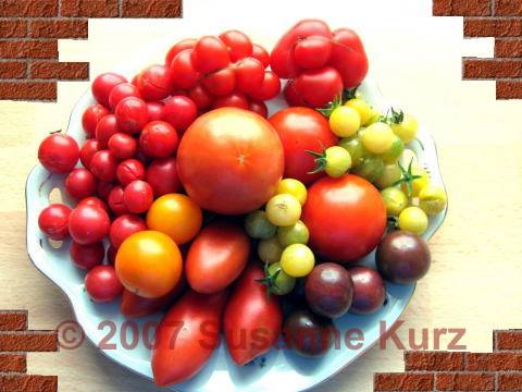 17.08.07 TomatenernteDas sieht nun endlich mal nach einer Tomatenernte aus. In der Mitte sieht man drei Glory of Moldava, oben zwei Reisetomaten, dann einige White Currant und die ein oder andere Bianca. Dann folgt die Black Cherry, drei Carnica, zwei Sungella und jede Menge Gartenperlen. Genau so soll es aussehen, und auf einen solchen Tomatenteller habe ich mich schon lange gefreut.