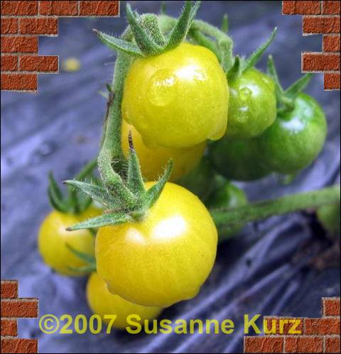 09.08.07 White CurrantInzwischen ist mit der White Currant die erste Sorte, die ich liegend auf dem Hügelbeet anbaue reif. Die kleinbeerige Wildtomate mußte ich an der gleichen Stelle bereits wegen Krautfäule roden und meine Lieblingstomate aus dem letzten Jahr, die (rote) Wildtomate ist noch immer nicht reif. Das gibt natürlich Punke auf der nach oben offenen Bewertungsskala. Ebenso, das sie bislang von den nicht enden wollenden Regenfällen ziemlich unbeeindurckt geblieben ist. Aber schlichtweg sensationell ist, dass die White Currant bei der fehlenden Sonne sehr süß ist. Ich habe es eigentlich schon bemerkt, als ich sie am 31.7. mit der Bianca verglichen habe, da wolte ich erst mal noch die nächsten Früchte abwarten, ehe ich meine Erkenntnisse in die Welt hinaus posaune. Gilt doch die Bianca auch als eine ausgewiesen süße Sorte. Etwas Internetrecherche, z.B. bei Reinhard Kraft ("sehr würzig und saftig, ein Hochgenuss!") oder bei Amishland Heirloom Seeds (This is the sweetest tomato I have ever grown. It has superb flavor) bestätigt allerdings meinen Eindruck