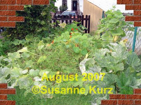 30.08.07 Hügelbeet im AugustLangsam aber sicher geht es mit den Pflanzen auf dem Hügelbeet bergab. Habe ich in den letzten Monaten festgestellt, dass die Vegetation etwa einen Monat weiter ist, als im letzten Jahr, so gilt das auch im August. Ich bin fast der Meinung, dass z.B. die Zucchini im Septemberbild des letzten Jahres weit aus weniger vom Mehltau befallen waren als jetzt im August..