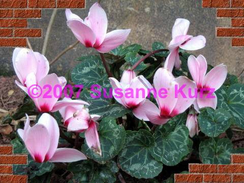 03.11.07 Alpenveilchen im FreilandNachdem ich im letzten Beitrag ein Frostopfer vorgestellt habe, möchte ich heute eine Zimmerpflanze zeigen, die an einer anderen Ecke des Gartens noch vollig unversehrt geblieben ist. Es handelt sich um ein Alpenveilchen (Cyclamen Persicum-Hybride), wie sie auch zur Zeit angeboten werden. Diese Pflanzen brauchen einen kühlen Standort, so stand sie im letzten Winter an meinem Küchenfenster, das nach Norden geht. Doch nach einiger Zeit werden die Blätter gelb und spätestens, wenn sie verblüht sind, wandern die meisten Alpenveilchen in die Mülltonne. Ich hatte die Pflanze in diesem Zustand an einen schattigen Platz im Garten ausgepflanzt, sie hat sich sehr gut erholt und Blüten angesetzt.