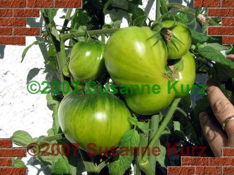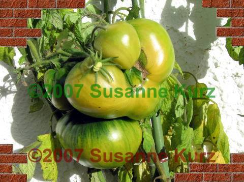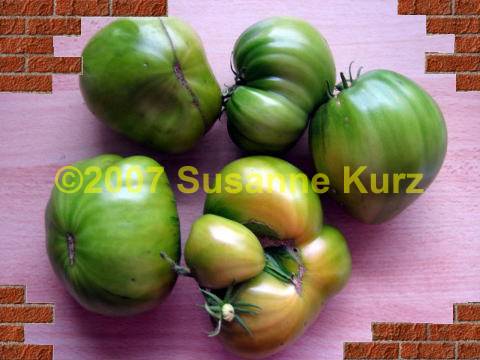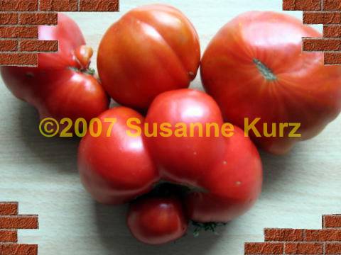 12.01.08 Ist Lenis Sibirischer Riese die Urkainische Birne?Bei einem Saatguttausch mit Leni habe ich eine rosafarbene Tomate erhalten, die sie "Sibirischer Riese" genannt hat. Unter diesem Namen konnte ich keine Informationen im Internet finden, habe sie aber mit dieser Bezeichnung weiter geführt. Zufällig bin ich gestern über die "Ukrainische Birne" oder auch "Ukrainian Pear" gestolpert, das könnte meine Lenis Sibirischer Riese sein. Darauf läßt mich nicht nur die Birnenform oder die rosa Farbe schließen. Was mich ziemlich sicher macht, ist die Tatsache, dass bei den wenigen Bildern, die ich im Internet gefunden habe, fast überall ein Grünkragen erkennbar ist. In meiner Beschreibung hatte ich das bereits erwähnt. In diesem Bild von www.tomatogrowers.com ist das auch gut an der oberen und der linken Frucht erkennbar. Auch die oberen Früchte in diesem Bild von www.tomatenundanderes.at haben einen gut erkennbaren Grünkragen. Als letztes Beispiel sei diese dänische (???) Webseite erwähnt, auch dort das leidige Grünkragenthema.... Das scheint ein sortentypische Problem zu sein, und macht mich daher ziemlich sicher.