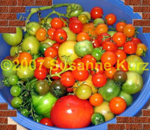 24.11.07 Letzte ErnteDas ist das letzte Erntebild des Jahres 2007. Nachdem ich am 14.11. die Herztomaten in Sicherheit gebracht hatte, habe ich am 18.11. die restlichen Tomaten abgenommen. Die dicke rote vorne ist eine Graf Batthyiani, sonst sind noch die Super Sweet 100 F1, einige wenige Black Cherry und die Sungella zu sehen. Zusammen mit den bereits geernteten Herztomaten waren das noch ca. 2 KG, die nun im Haus nachreifen können.