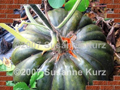 01.11.07 VerzocktIn der Zwischenzeit habe ich einen Teil der Kübelpflanzen wieder aus dem Keller geräumt. Meine Kübelpflanzen verkraften, wenn sie geschützt an der Südwand des Hauses stehen, doch tiefere Temperaturen, als oft als Richtlinien zu lesen sind. Ich nehme an, dass die Autoren einen gewissen Sicherheitszuschlag eingerechnet haben. Ich möchte den Pflanzen möglichst lange Tageslicht gönnen, denn im Winterquartier, bei schlechteren Bedingungen werden die empfindlicheren Pflanzen leicht von Schädlingen, wie der weißen Fliege oder Blattläusen befallen. Aber jeder muß das eigene Klima und auch das Mikroklima in den verschiedenen Bereichen des Gartens selbst beobachten und wissen, wieviel Risiko er einzugehen bereit ist..Konkret bin ich gerade mit meinen Kürbissen ein zu hohes Risiko eingegangen und habe heute morgen die Quittung dafür erhalten: mein Kürbis Muscade de Provence hat heute nacht wohl zu viel Frost abbekommen und ist aufgeplatzt.